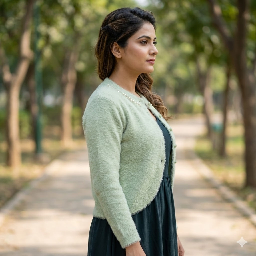 Wrap yourself in softness with this charming sage green fuzzy Jacket. Featuring a delicate pearl-embellished neckline and a sparkling crystal butterfly accent, this cozy knit offers a perfect blend of elegance and warmth. Ideal for pairing with jeans or skirts for a chic, feminine winter look.
